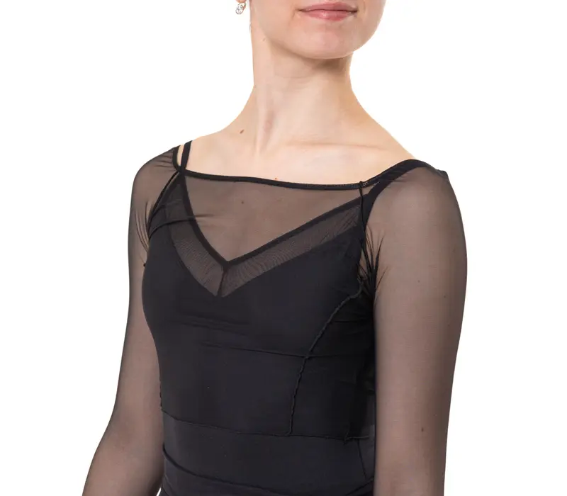 Síťovaný top limitované edice Dusk Mesh, vyrobený z prodyšné směsi nylonu a spandexu. Barevný materiál je na dotek jemný a elastický, v černé barvě je elasticita menší. Lodičkový výstřih a princeznovské švy v přední části působí sofistikovaně a vytvářejí pěknou siluetu. Dlouhé rukávy mají užší střih. Top vypadá velmi elegantně. Doporučujeme objednávat o číslo větší velikost, než je běžná, konfekční.
