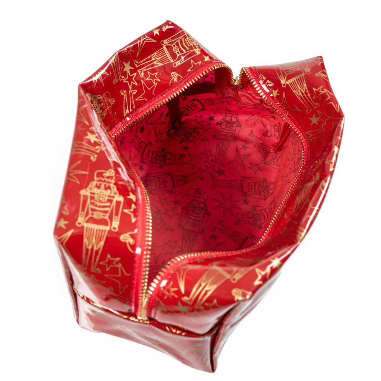 Kosmetická taška v úžasné červené barvě s motivem Louskáčka, připomínajícím vánoční svátky, je skvělým doplňkem pro každého účinkujícího.