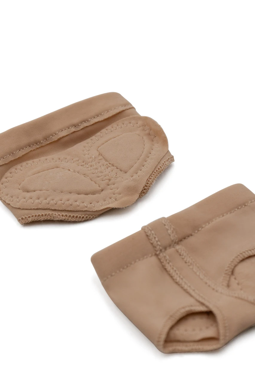 Chraňte si chodidla při točkách. Na spodní části jsou dva samostatné polštářky, pro "bříško" velkého palce na noze a pro "bříška" na ostatních palcích nohy. Podobným způsobem jsou řešeny otvory pro nasunutí. Jeden je určen pro velký palec na noze. Ostatní prsty mají samostaný otvor. Do taneční ťapky byl vložen silikonový gel. Materiál je velmi příjemný, elastický, hladký. Materiál, který obepíná prsty je nylon lycra spandex.