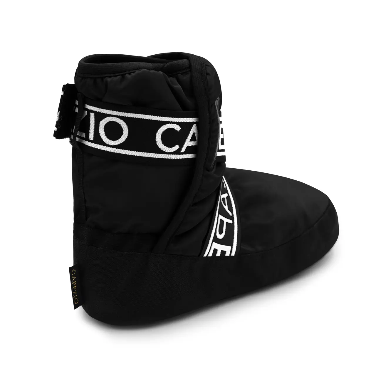 Protiskluzová, měkce polstrovaná podrážka zajišťuje stabilní kontakt se zemí a rovnoměrné rozložení váhy, díky čemuž jsou ideální pro pohyb v tanečním sále. Vnější materiál z taffeta polyesteru v kombinaci s měkkou polyesterovou výplní poskytuje příjemnou tepelnou izolaci bez omezení pohybu. Elastické, nastavitelné pásky s logem Capezio kolem kotníku zaručují bezpečné, pohodlné a individuální přizpůsobení.