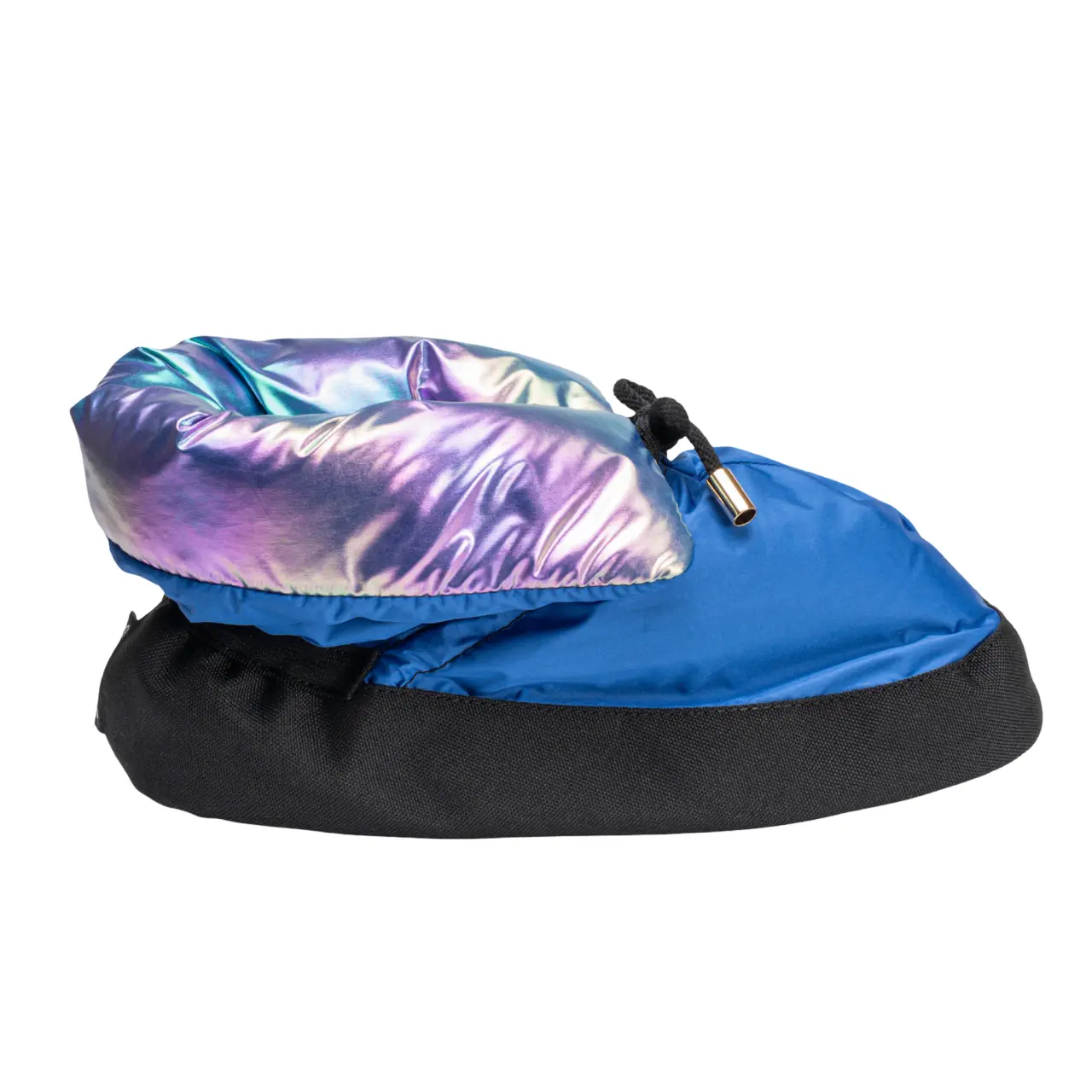 Elegantní sametový lem, jemné zlaté metalické detaily a lesklý taftový polyester vytvářejí luxusní vzhled. Materiál je odolný proti vlhkosti a mačkání a zároveň si krásně drží tvar. Protiskluzová, měkce polstrovaná podrážka zajišťuje stabilní kontakt s podlahou a rovnoměrné rozložení váhy, díky čemuž jsou botičky ideální i pro pohyb ve studiu.