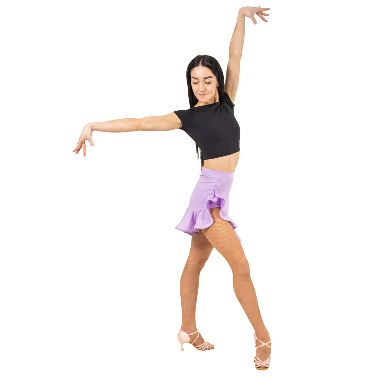 Vlnkovitý lem a jemná krajka dodávají sukni hravost a energii, která ožívá při každém tanečním kroku. Asymetrický střih, delší na jedné straně a kratší na druhé, zaujme na první pohled.