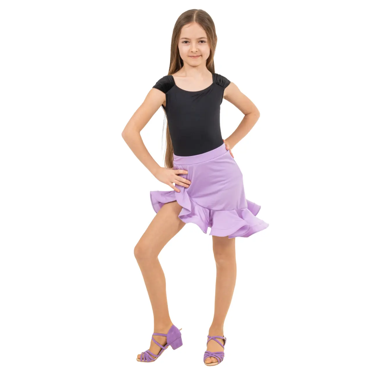 Klara - sukně pro dívky, které mají v oblibě latinskoamerické tance. Je elegantní, pohodlná a zvýrazňuje dynamiku pohybu. Elastický materiál, který jemně obepíná boky, plochý elastický pas zaručují, že sukýnka zůstane vždy na svém místě a nebude omezovat pohyb malé tanečnice.